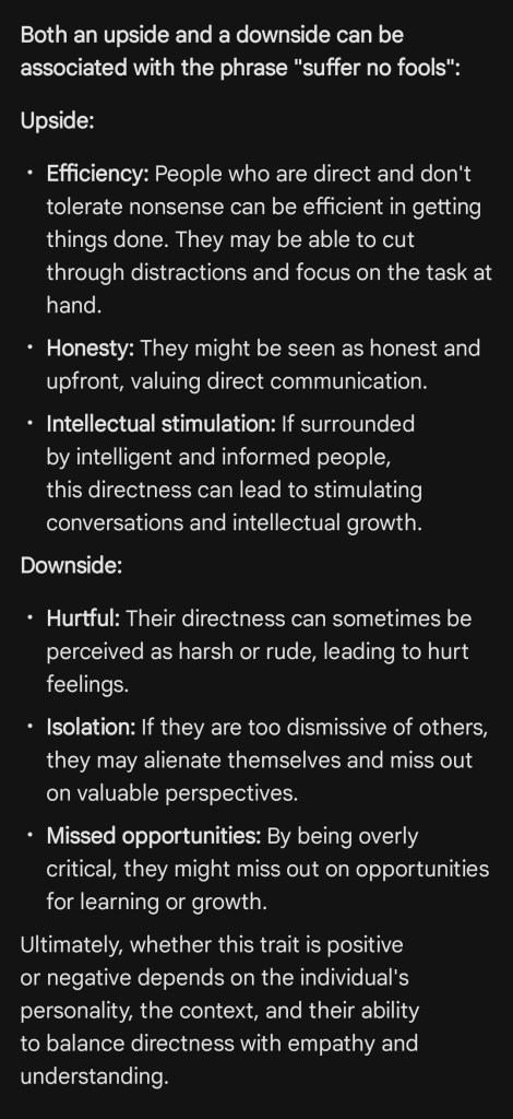 The next day, my Mentor’s words still acutely circling my brain, I turned to my new toy, Gemini, and consulted its Artificial Intelligence capabilities to explore the nature or characteristics of those who don’t suffer fools. I had a hunch I needed a comprehensive look at what the phrase means and all the layers it could imply. The good and bad, so to speak. The light and shadow sides. Gemini did not disappoint.